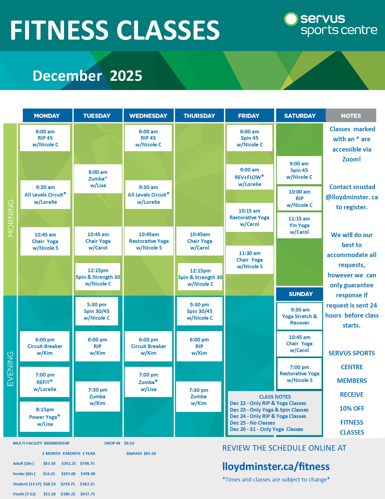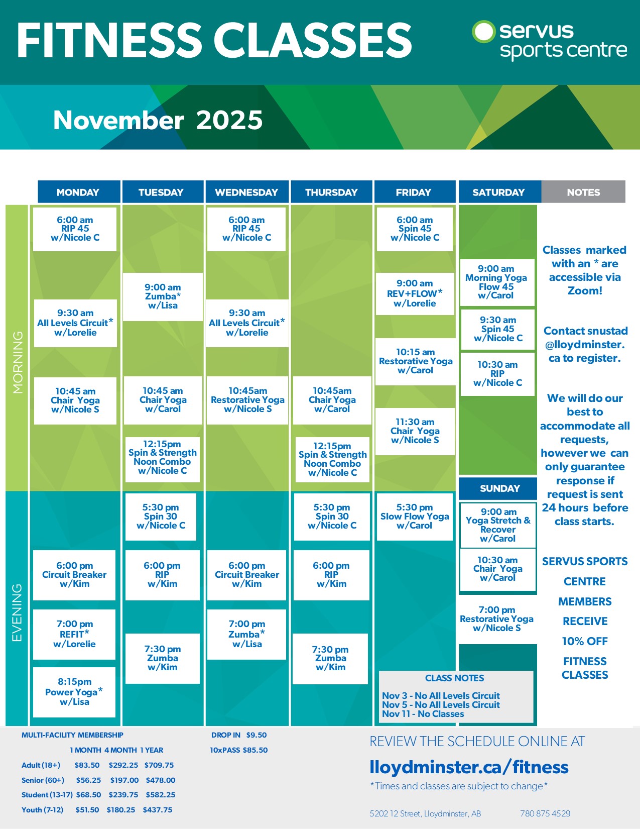 Many of our classes are offered in person and on Zoom. On our Fitness Class Schedule, the classes marked with an asterisk* are offered virtually. If you wish to join us virtually, please fill out the Get Active Questionnaire, sign it as well as the virtual waiver and deliver it in person to the Servus Sports Centre or email it to snustad@lloydminster.ca. In the email, please include what classes you wish to attend. If you do not have a valid fitness class pass on your account then include a phone number that we can reach you at to get payment information. Purchase a multi-facility membership today!