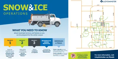 The City of Lloydminster's Transportation Services team monitors weather reports so crews are ready for significant snowfalls. If a snow event is forecasted, additional staff are on-call for weekends. Snow is cleared from roadways in priority order and plowing takes precedence over any snow removal.
